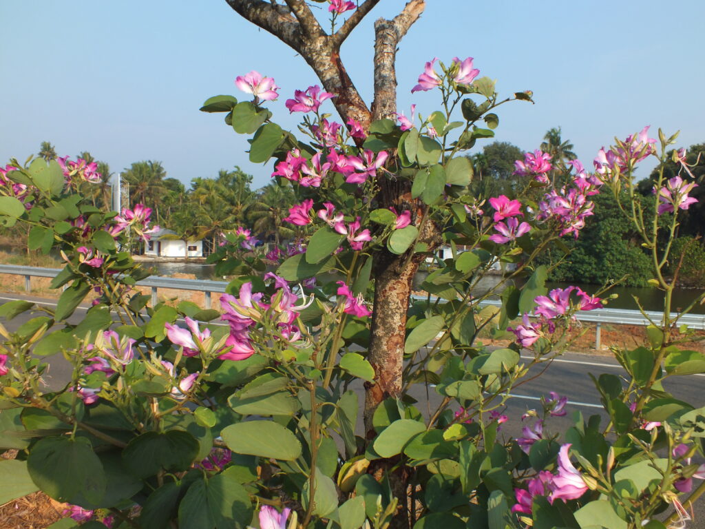 Description: A medium size tree. The bark of Bauhinia variegata is dark brown. The leaf lamina has a medium cleft and is longer than it is wide. A pubescent raceme is an inflorescence. Tomentose calyx with five teeth at the tip. Five petals, the fifth having a darker purple colour and purple veining, have long, rather broad claws. Five fertile stamens without staminodes. Hairy ovary; lengthy style; capitated stigma. Fruit is a dehiscent pod with 10–15 seeds.